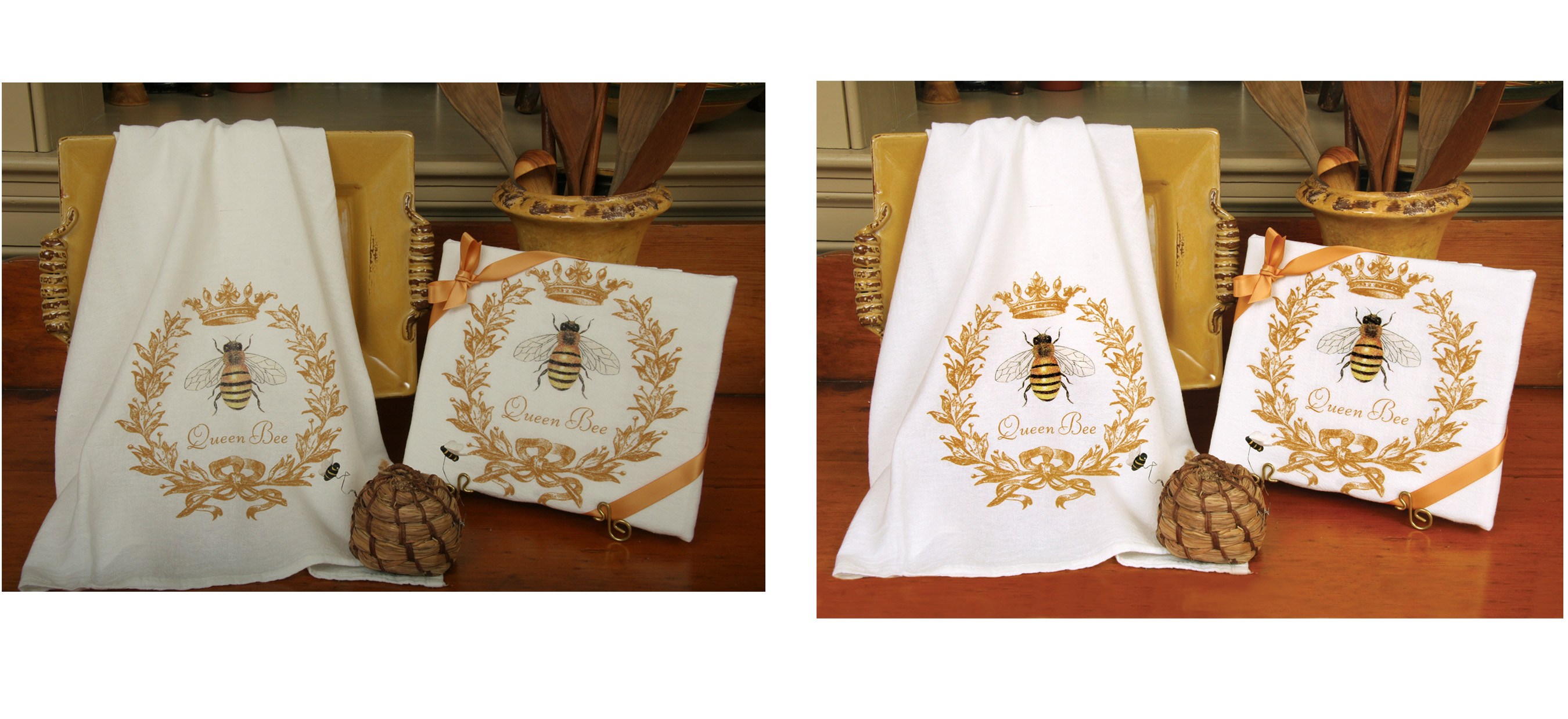• Edited Photo: (Lifestyle Floursack Towel Shot) - Color corrections (white point, contrast, presence, shadows/highlights, vibrance, and tone adjustments), shadows added, and table area extended. (Display Box) Background clipped and removed, color corrections, touchups (removing prototype marks and imperfections), shadows added.
