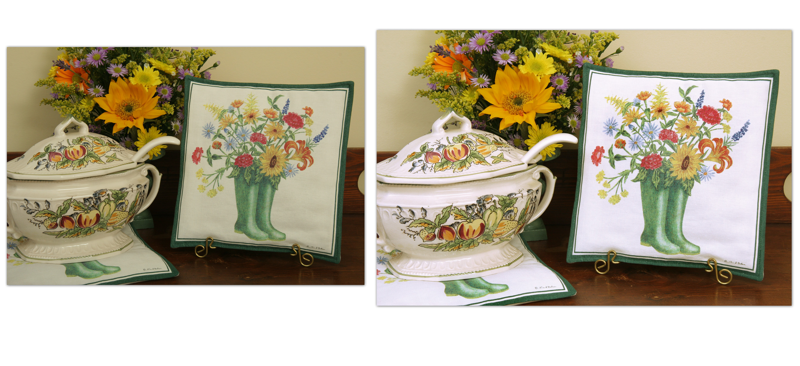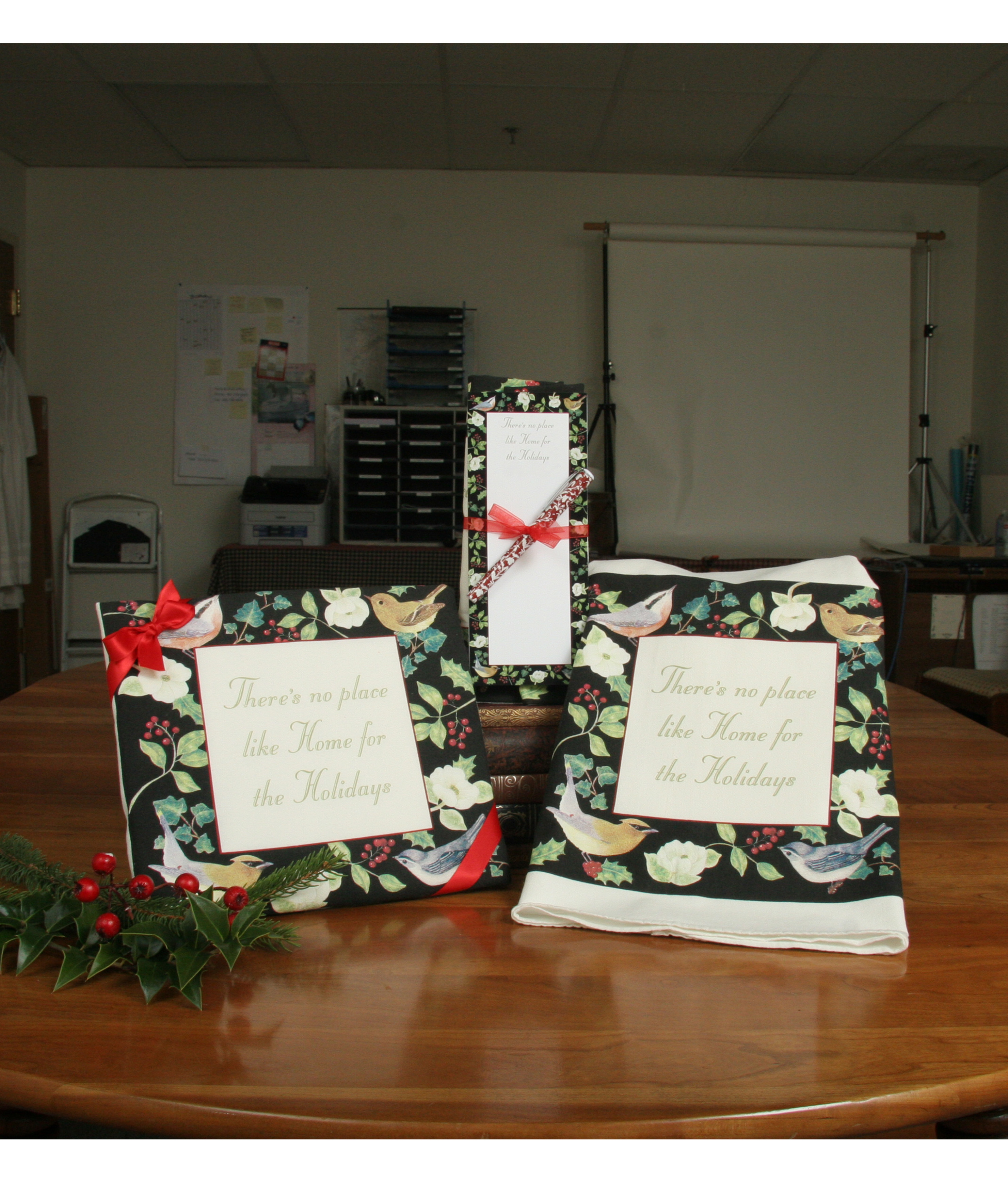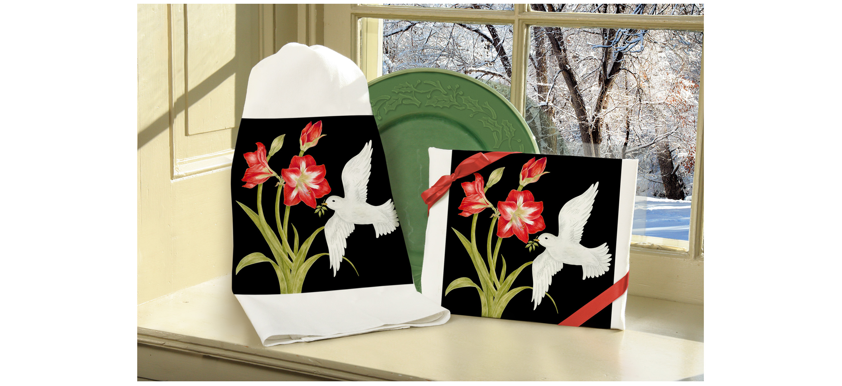 • Winter Dove - Replaced raised dragonfly plate design with raised holly for Holiday theme, superimposed new artwork on towels, artwork distorted for perspective, added shadows and reflections, ribbon color change and adjustments, added wintery snow scene outside window.
