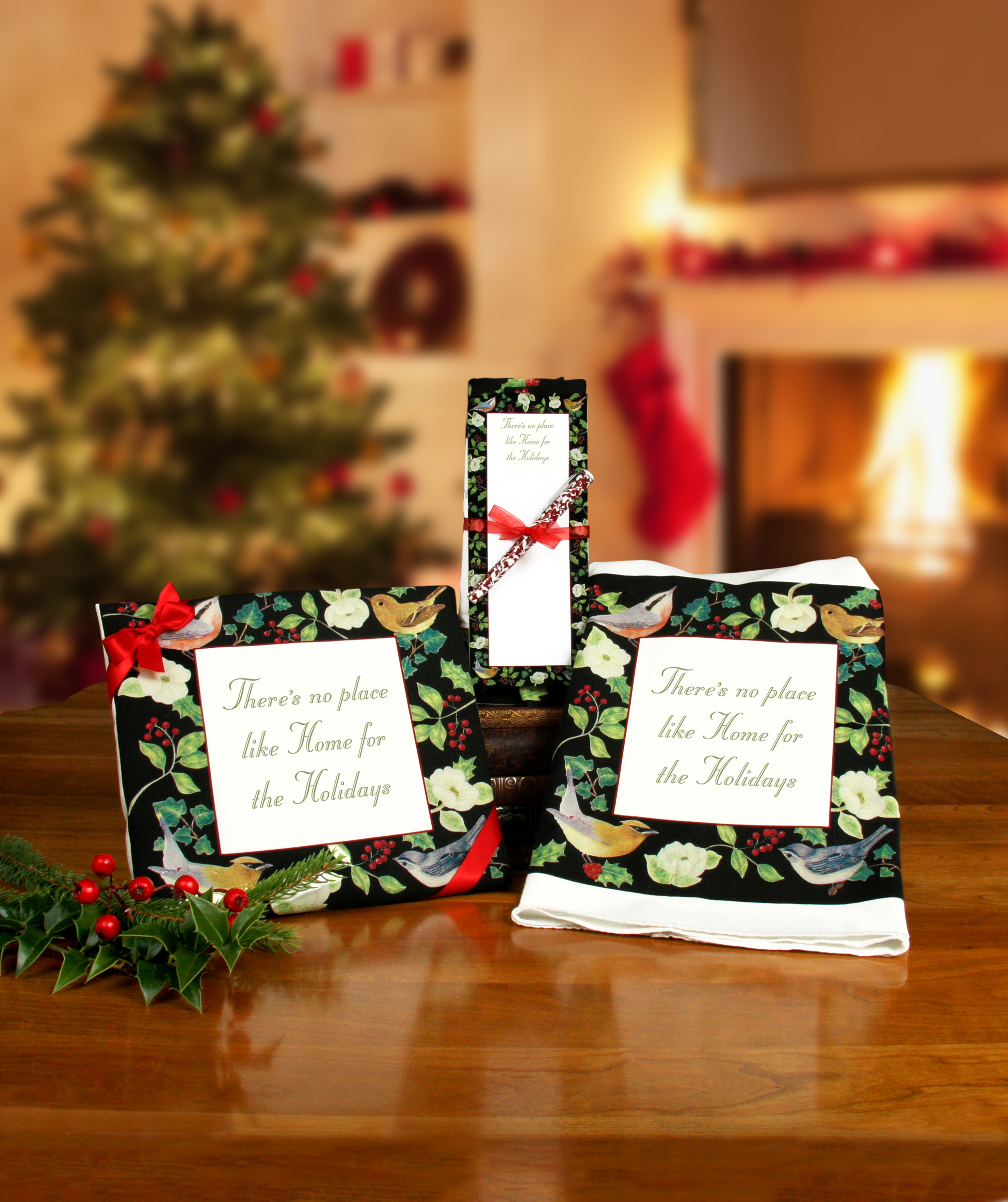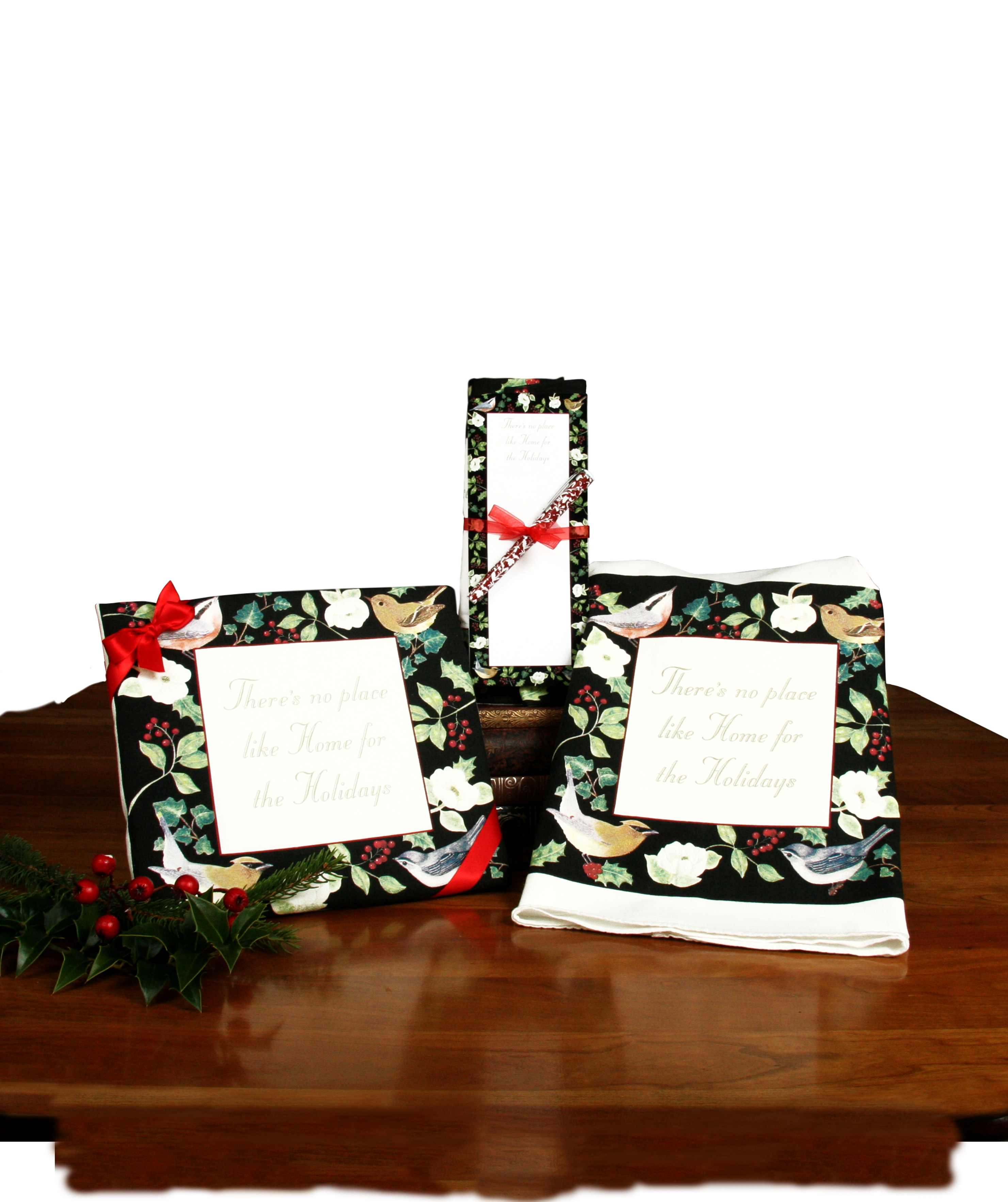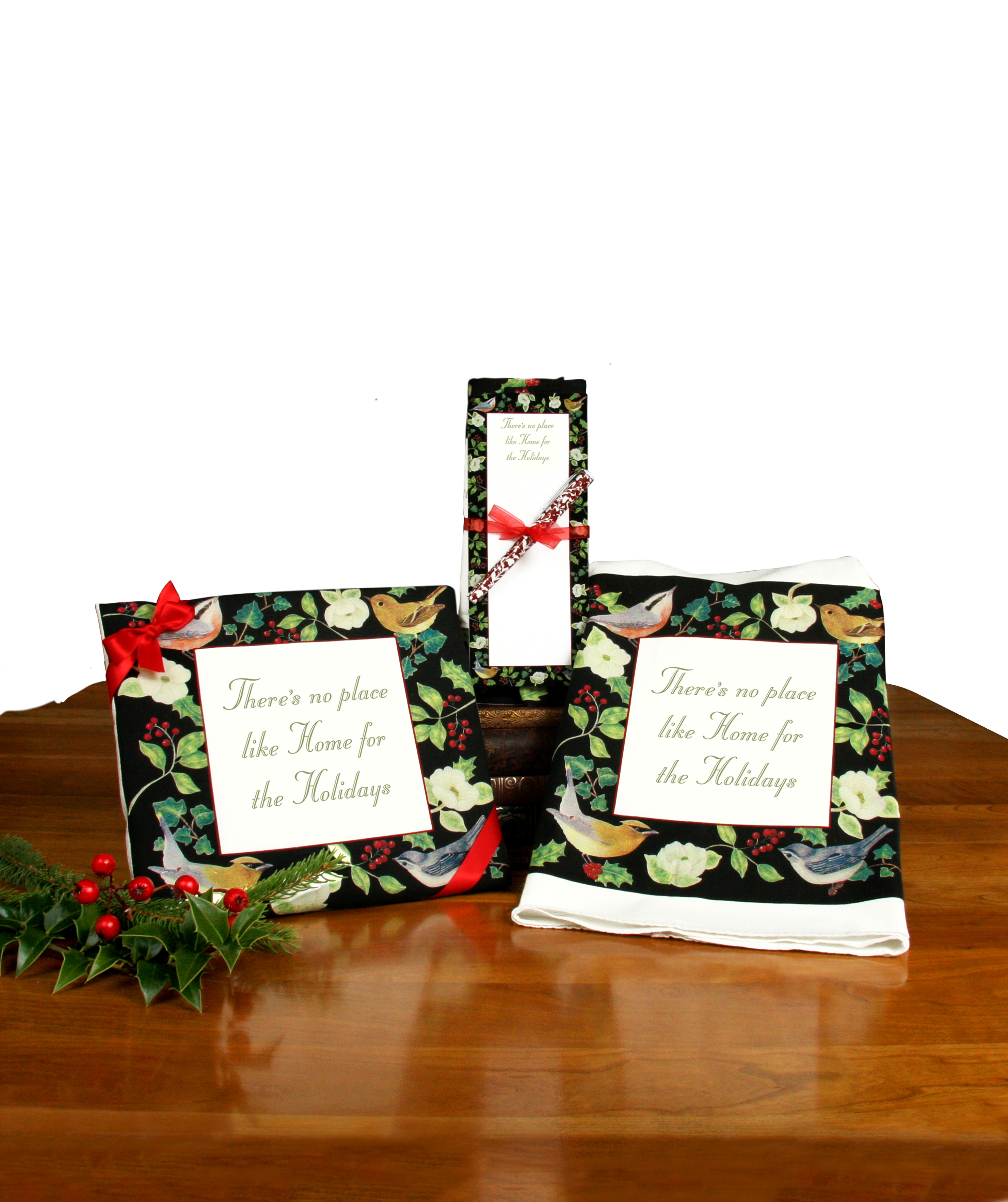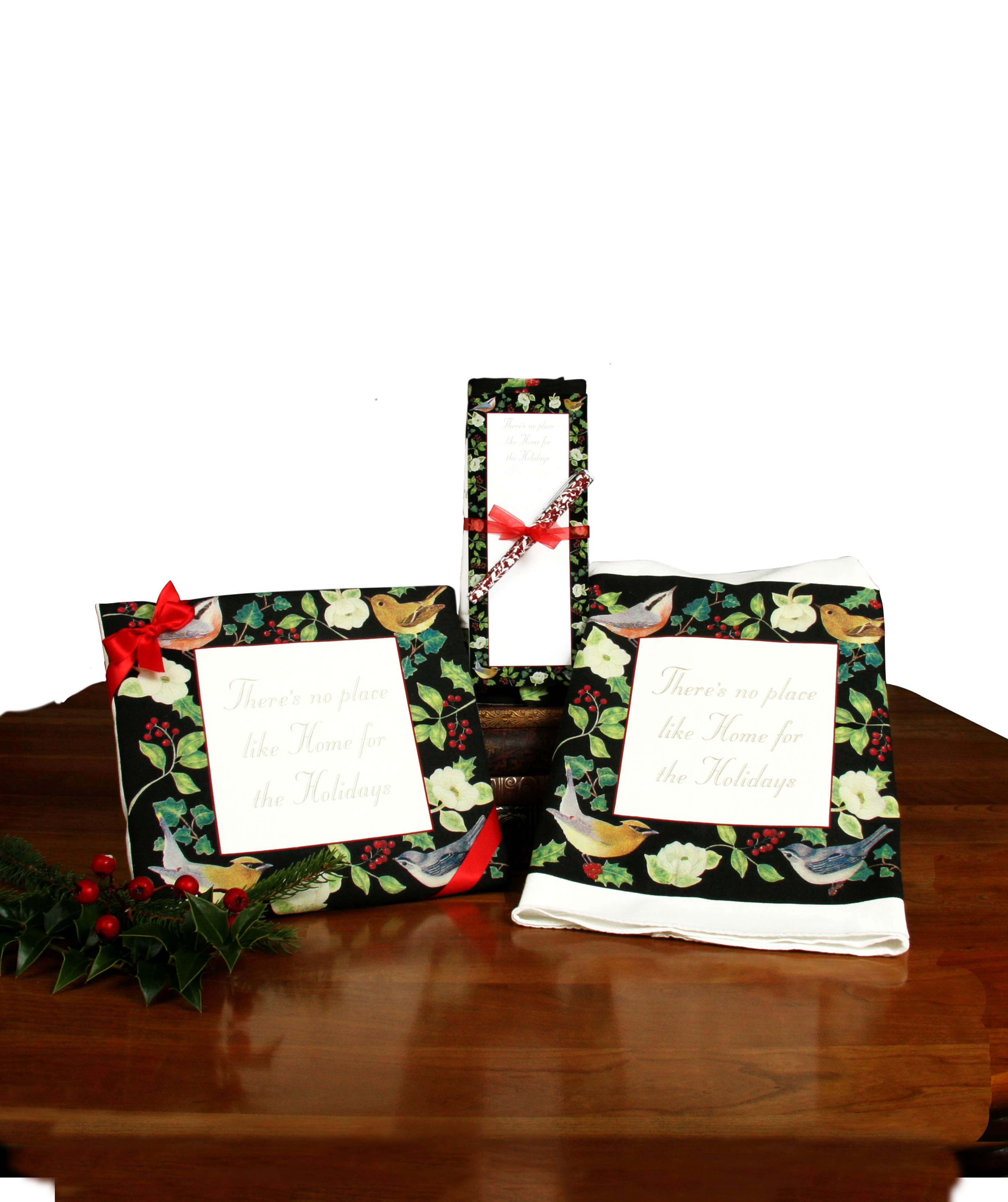 • Winter Dove - Replaced raised dragonfly plate design with raised holly for Holiday theme, superimposed new artwork on towels, artwork distorted for perspective, added shadows and reflections, ribbon color change and adjustments, added wintery snow scene outside window.