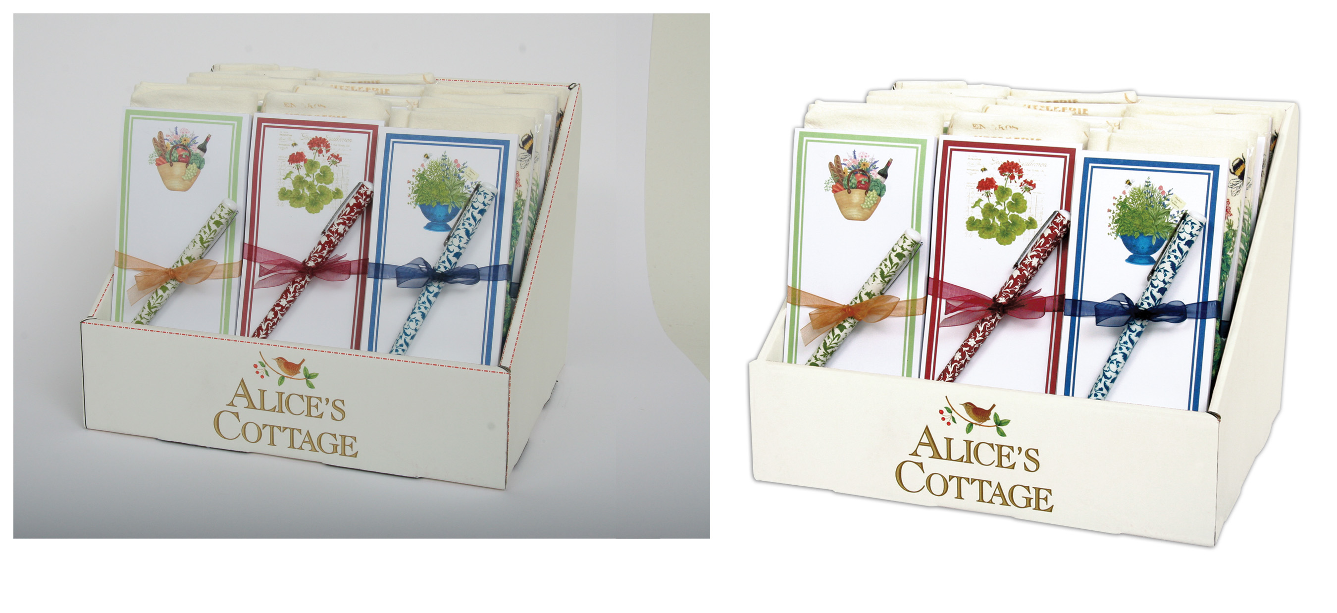 • Original Photo: (Lifestyle Floursack Towel Shot) Product in a digitally printed prototype cardboard display. (Display Box) Product in a digitally printed prototype cardboard display.