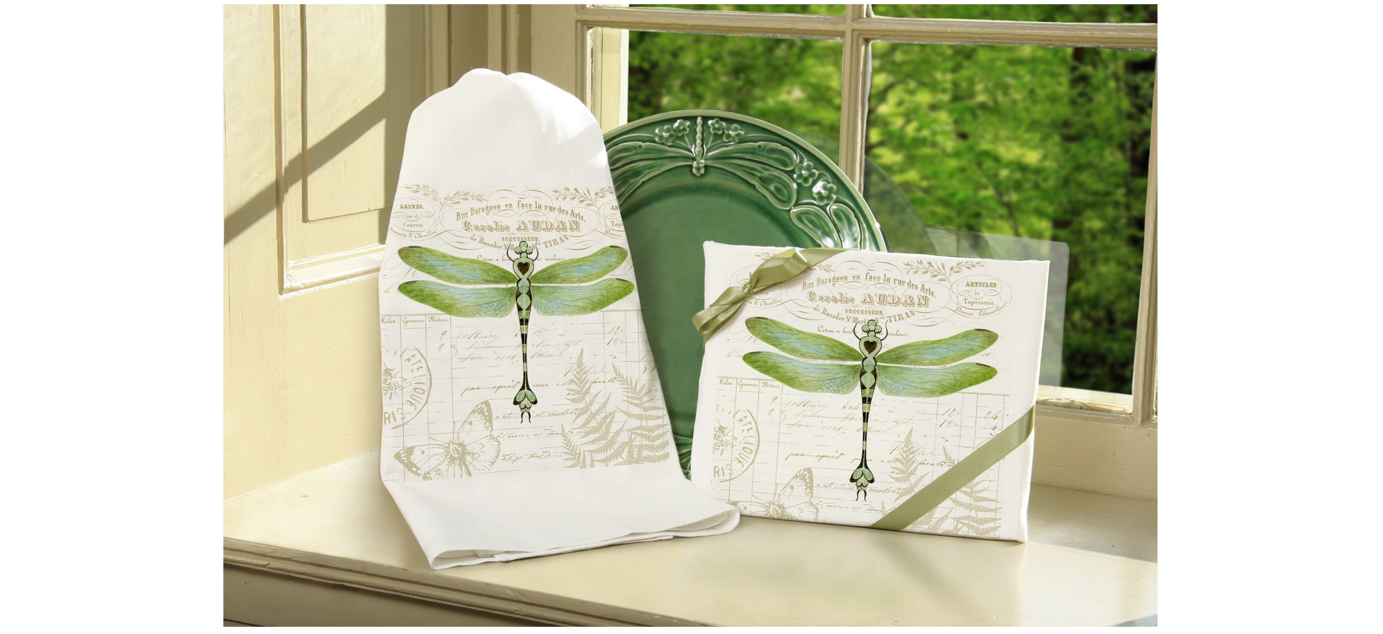 • Dragonfly - Superimposed clean artwork on towels, replaced artwork distorted for perspective, added shadows and reflections in window and ledge, added wooded scene outside window for a summer theme.