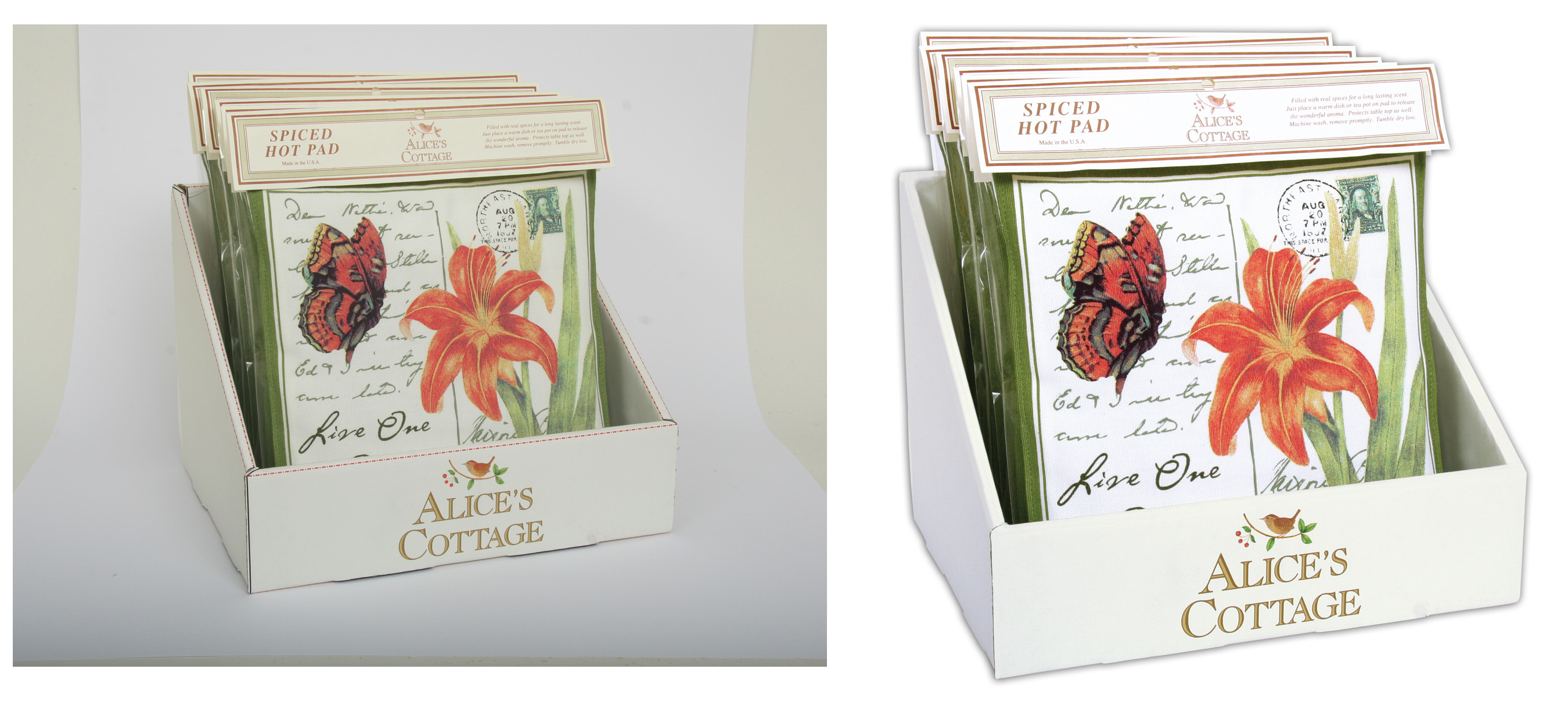 • Background Removal: (Tabletop Spinner Display & Tea Tote) - Removed background utilizing path clipping and adding drop shadows.